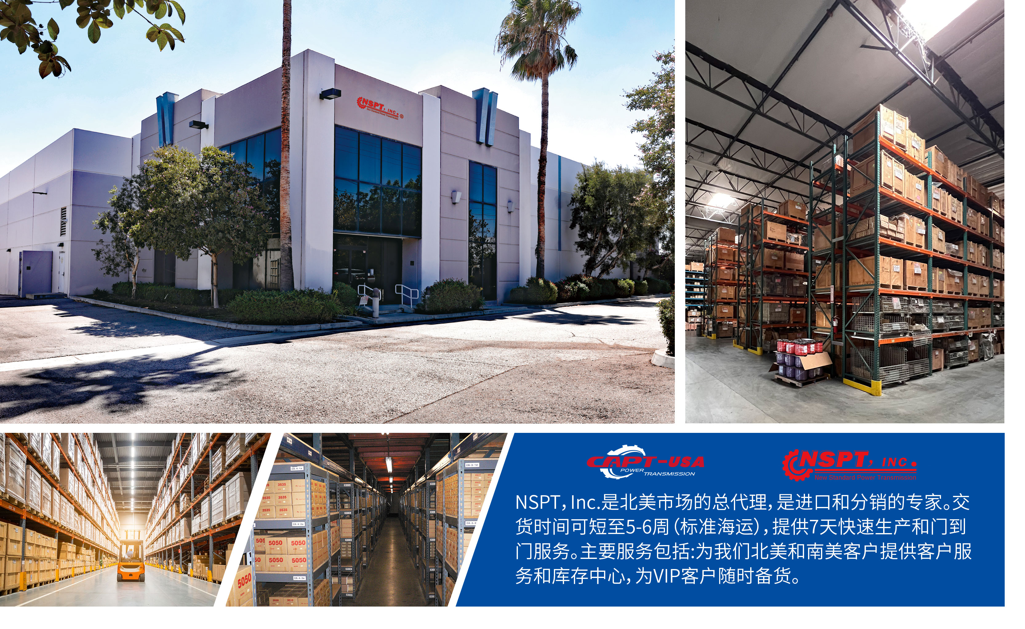 NSPT-USA, Inc. 為石家莊凱普特動力傳輸機械有限責任公司北美分銷商,成立于2005年,是一個在標準傳動產品行業成長較快的專業分銷商,負責在美國、加拿大等北美地區的采購、庫存管理和銷售工作。