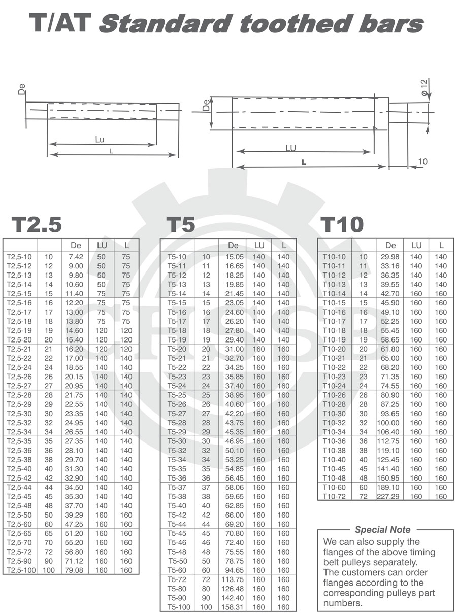 產(chǎn)品范圍: 美標(biāo)/歐標(biāo):(T2.5/T5/T10) 英制尺寸產(chǎn)品(適用于美標(biāo)市場(chǎng)) 公制尺寸產(chǎn)品(適用于歐標(biāo)市場(chǎng)) T/AT齒棒、圓弧齒、STD同步帶輪、圓弧齒齒棒