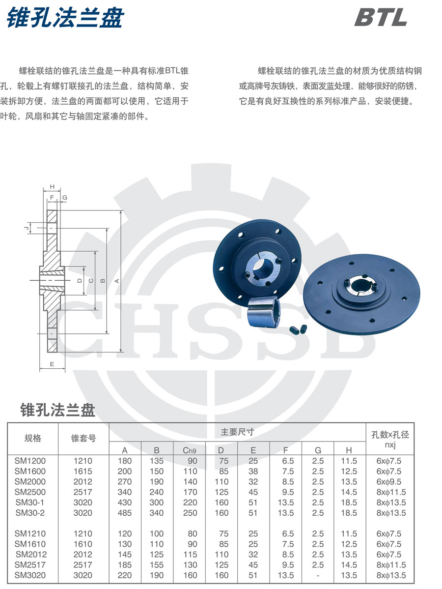 螺栓聯(lián)結(jié)的錐孔法蘭盤是一種具有標(biāo)準(zhǔn)BTL錐孔,輪轂上有螺釘聯(lián)接孔的法蘭盤,結(jié)構(gòu)簡單,安裝拆卸方便,法蘭