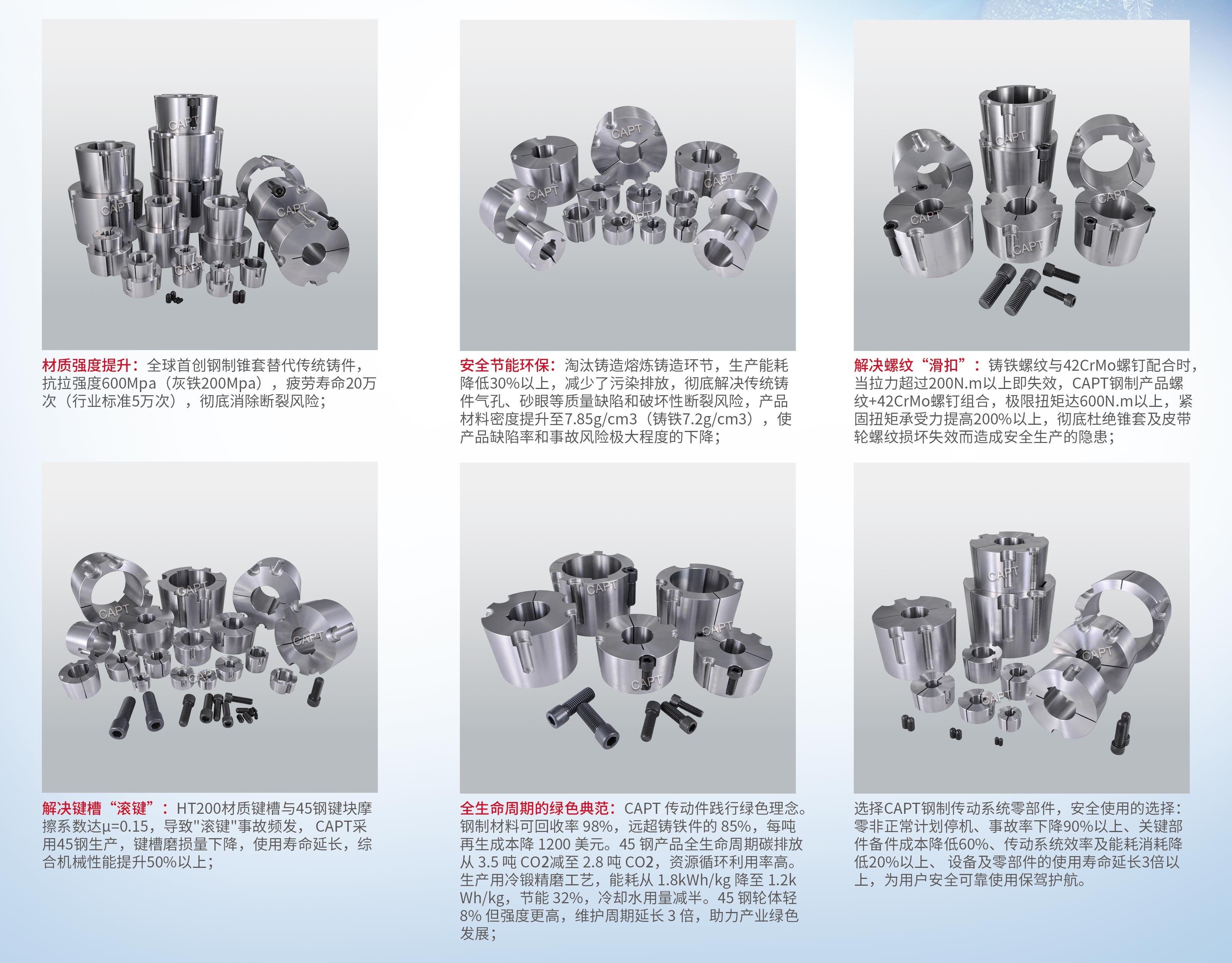 石家莊凱普特公司作為中國首家鋼制錐套研發(fā)生產(chǎn)企業(yè)及國家錐套標(biāo)準(zhǔn)起草單位(成立于1986年),CAPT近40年專注高端傳動件制造,以高強度、高精度、少無隱患、綠色環(huán)保、可持續(xù)發(fā)展為核心,率先完成錐套、皮帶輪、鏈輪產(chǎn)品的安全升級: